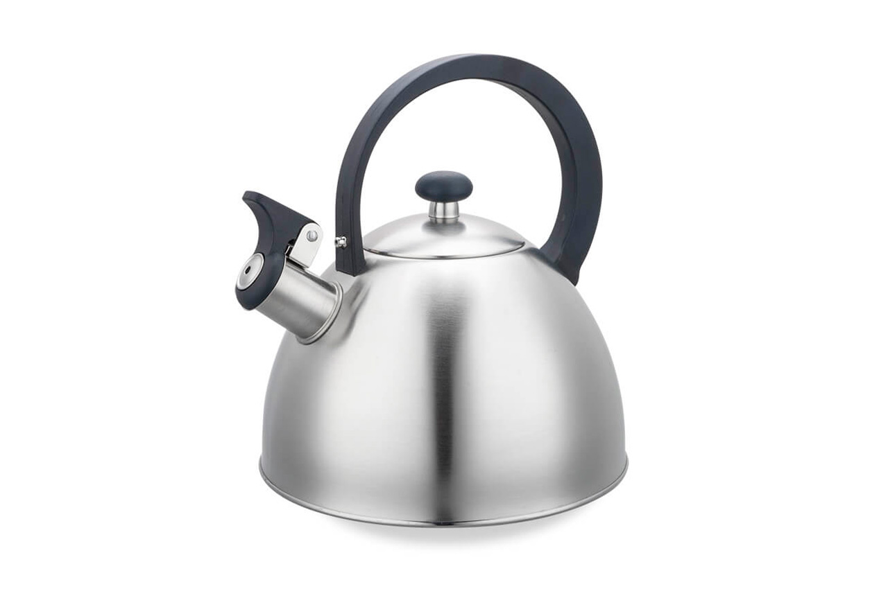 Чайник об’ємом в 2,5 л виготовлений з високоякісної нержавіючої сталі з глянсовою поліруванням. Оснащений клапаном-свистком і важелем для безпечного відкривання / закривання. Одношарове індукційне дно.Кришка чайника сталева з бакелітовій ручкою. Підходить для всіх типів плит, включаючи індукційні.
