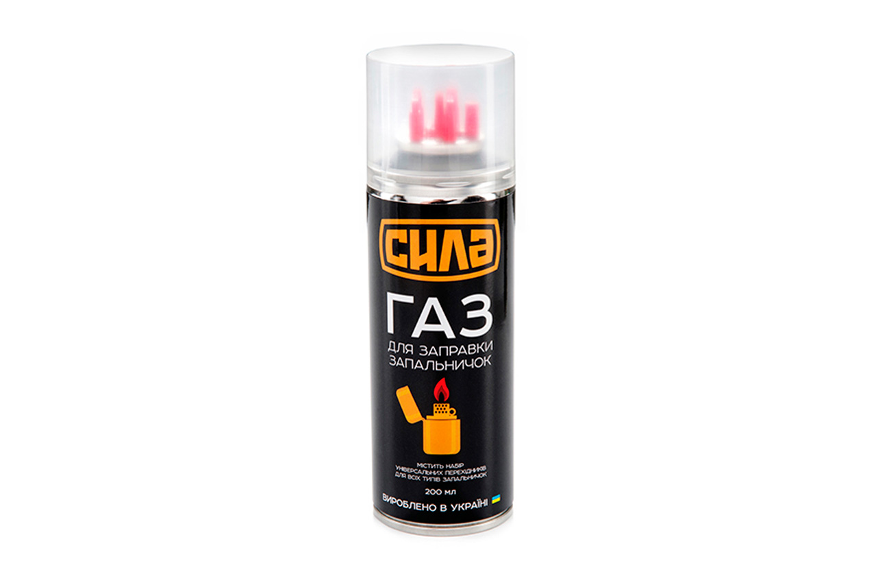 Газ для заправки запальничок Сила – 200мл. У побутових, туристичних умовах все рідше стали використовувати запальнички, які потребують встановлення чи зміни насадок. Більш практичними стають побутові запальнички, які зручно просто заправляти балоном. Для заповнення запальнички переверніть балон клапаном вниз і притисніть до клапана запалювання буквально на кілька секунд. І повторити процедуру 2-3 рази. За потреби, скористайтеся спеціальними перехідниками, які в комплекті з балоном.