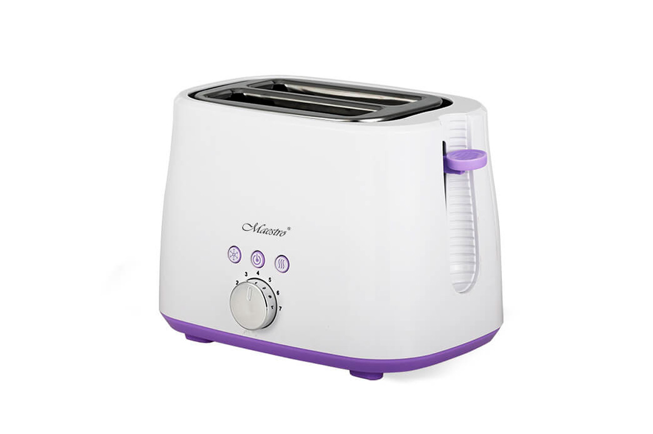 Тостер Maestro MR 707 потужністю 850-1000 Вт має 7 режимів прожарювання, випускається у зручному пластиковому корпусі білого кольору з фіолетовими елементами. У передній частині корпусу розташовані ручки вибору режимів та кнопки управління. Тостер призначений для підсмаження шматочків хліба з можливістю утворення хрусткої скоринки.