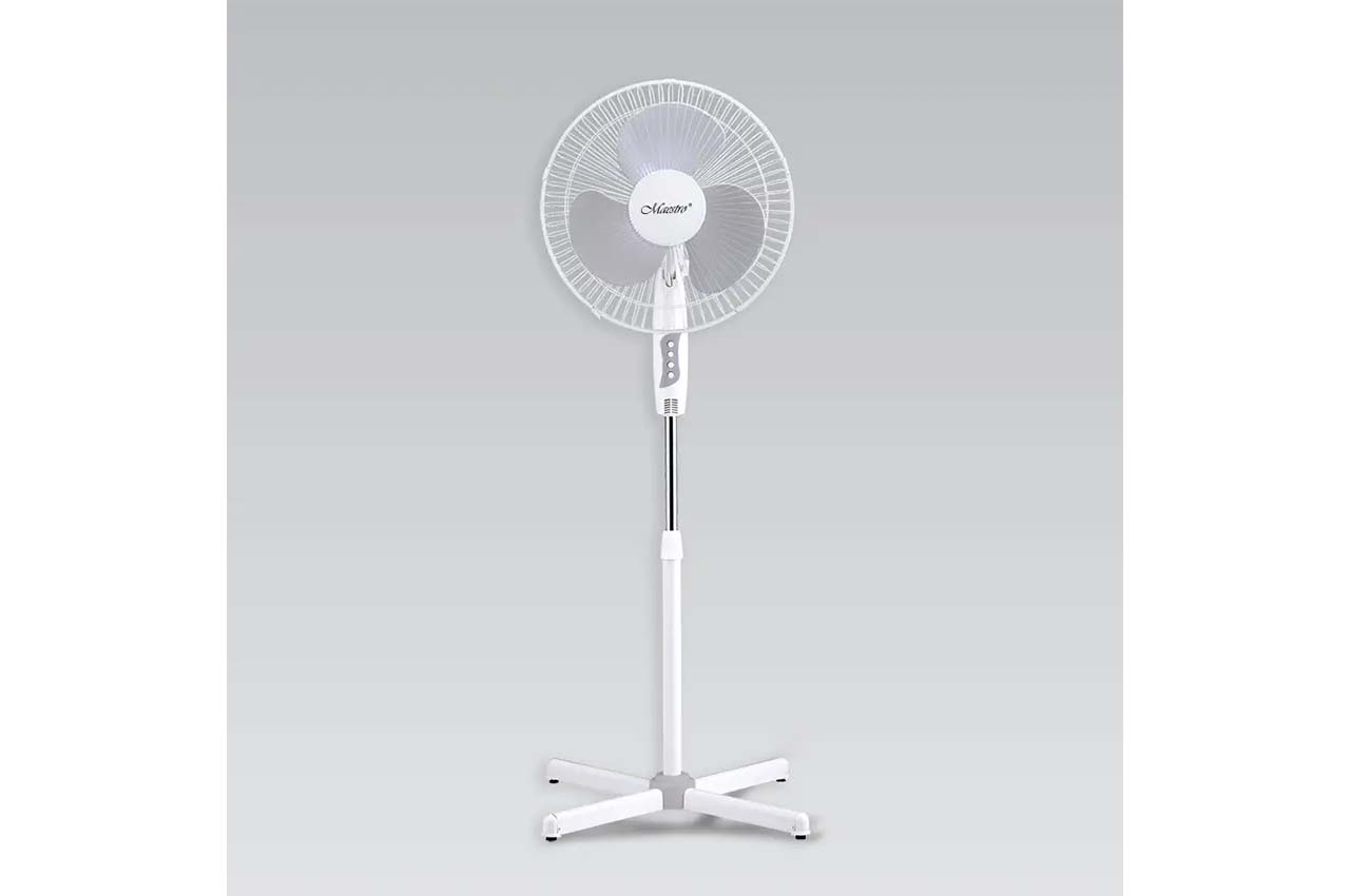 Вентилятор Maestro MR-900 поєднує комфорт з елегантним дизайном за доступною ціною. Це вентилятор для підлоги, що має діаметр лопатей 40 см, захищених основою у вигляді металевої решетуванням типу «WEB». Завдяки решетуванні виключається прямий контакт з лопатями вентилятора під час їх обертання, що свідчить про високий рівень безпеки. Лопаті вентилятора представлені різними відтінками кольорів: білий, сірий, синій і зелений. Ці відтінки дозволяють підібрати вентилятор під дизайн інтер’єру кімнати, де він розміщуватиметься. Вентилятор має стійку основу хрестоподібної форми. Прилад здатний функціонувати у стаціонарному положенні, а також із поворотом на 90 градусів. Працюючи в режимі з поворотом забезпечується рівномірне охолодження повітря в приміщенні. Вентилятор має регулювання висоту, тому його можна налаштовувати усілякими способами. Ручне керування вентилятором виконується завдяки зручному пульту, розташованому на корпусі під лопатями. Пульт має зручні кнопки перемикання режимів швидкостей та відключення. Середня потужність вентилятора дозволяє забезпечувати ефективне охолодження повітря у приміщенні. Практично безшумний режим роботи обов’язково зможе порадувати вас навіть у нічний час.