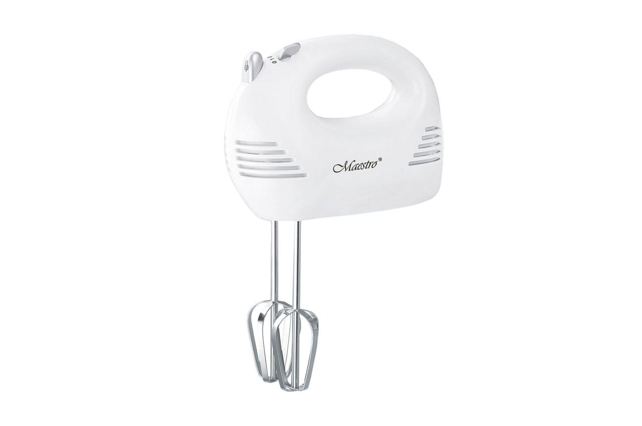 Міксер ручний Maestro MR500 потужністю 100 Вт має 5 режимів швидкості. У комплекті поставляються 2 віночки для збивання крему та яєць та 2 насадки для крутого тіста.