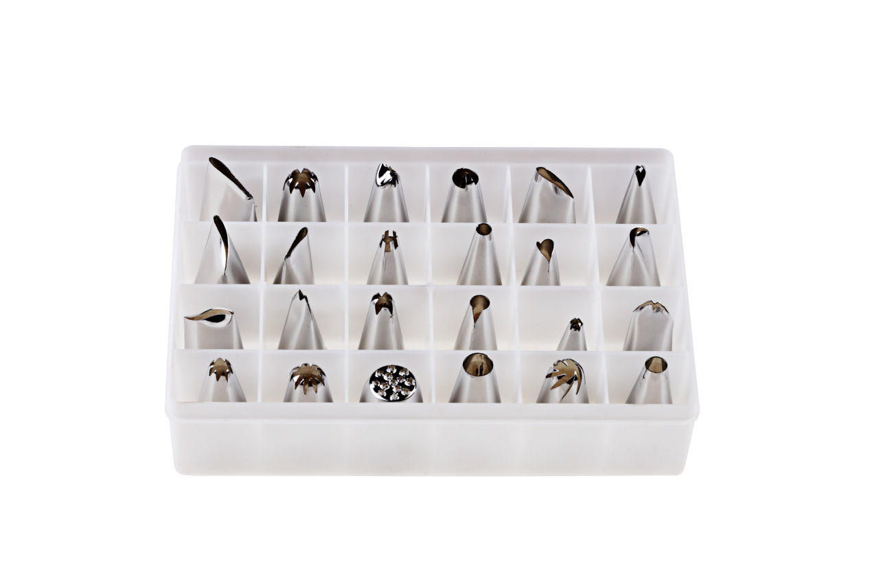 Набір насадок кондитерських Empire від інтернет-магазину Циліндр – в допомогу початківцям кулінарам і професіоналам зі стажем. З їх допомогою майстра створюють кремові прикраси для мафінів, тістечок і тортів. Всі 24 елемента виготовлені з високоміцної нержавіючої сталі. Матюкав не схильний до корозії, а виразний рельєф вихідного отвору діаметром від 9 до 14 мм дає зелене світло найбільш незвичайним композиціям. Не менш важливою перевагою металевих насадок Empire над пластиковими аналогами вважається краща стійкість до ударів і подряпин.