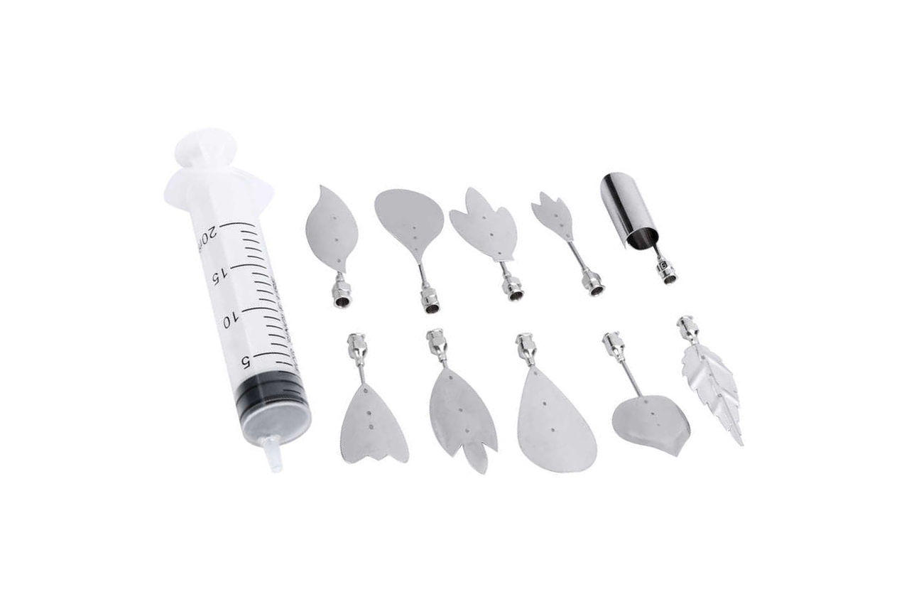 Шприц кондитерський Empire ємністю 50 мл знадобиться для швидкого приготування желе з так званим акваріумних ефектом. Маються на увазі декоративні елементи різних форм і відтінків в піалі з вмістом. Це можуть бути пелюстки рослин, реалістичні бутони троянд або, наприклад, фігурки тварин з кумедними мордочками. У наборі – 10 насадок з нержавійки, з допомогою яких можна «малювати» картини прямо в харчовому розчині. Середня довжина голок різної конфігурації – 25 мм.