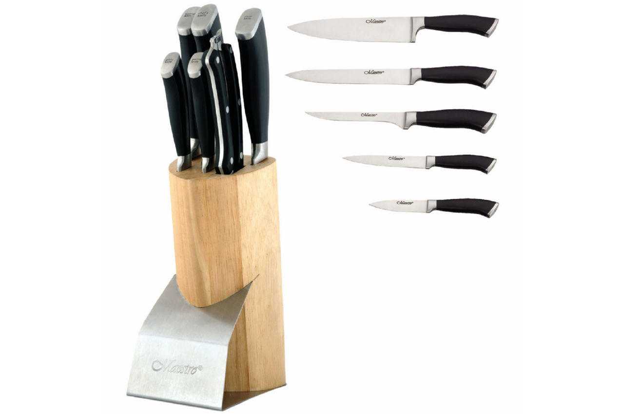 Виробник – Maestro;Країна виробник – Китай;Матеріал леза – Нержавіюча сталь;Матеріал рукоятки – Пластик;Кількість предметів в наборі – 7;Підставка – Так;Тип – Японський шеф-ніж (Сантоку);