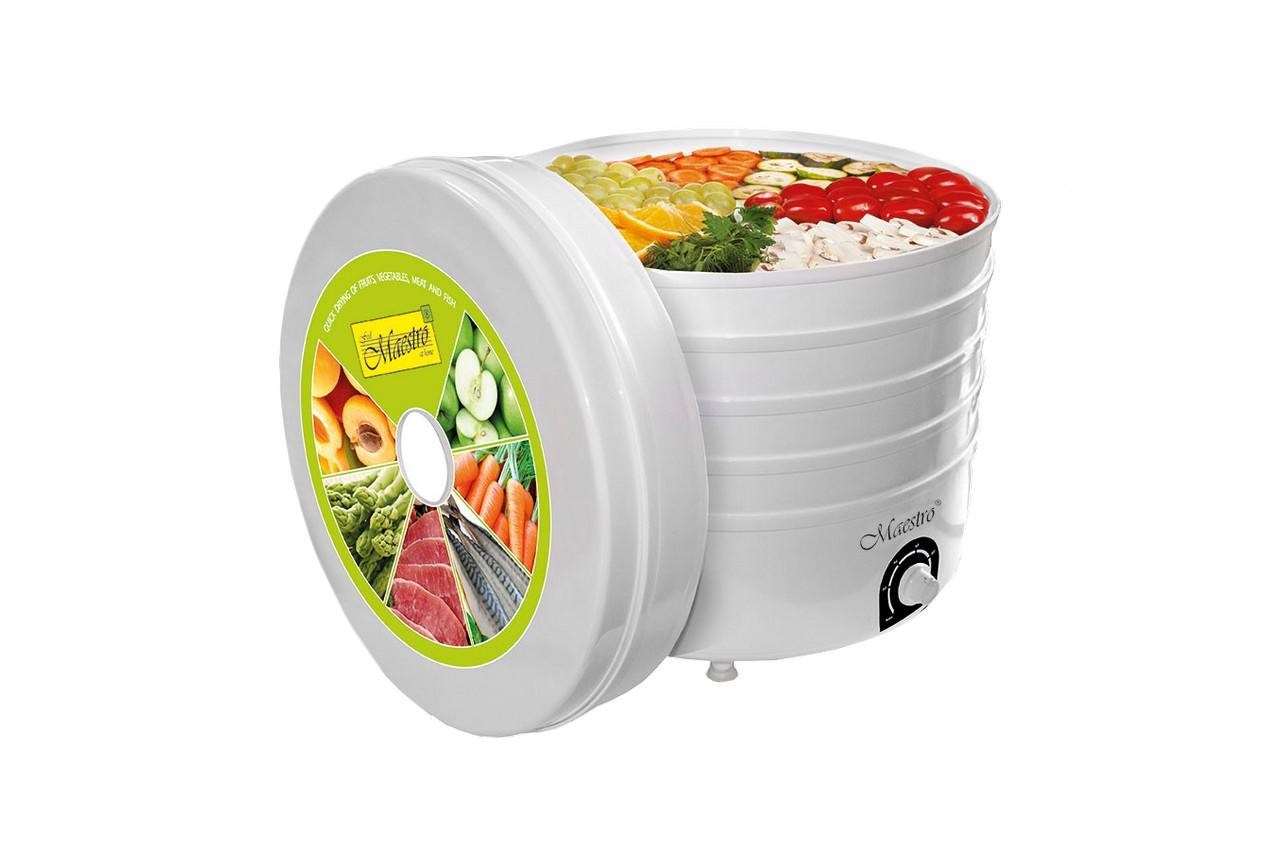 Сушарка для овочів та фруктів Maestro MR-766 представляє сучасний кухонний пристрій, з яким кожна господиня зможе висушити різні фрукти, овочі, ягоди, трави. Прилад оснащений 5 лотками для розміщення продуктів. Сушар має великі розміри, а також пульт управління на лицьовій стороні. На пульті представлено кнопку включення з індикатором, а також регулятор температури. Від встановленої температури залежить час висушування продуктів.