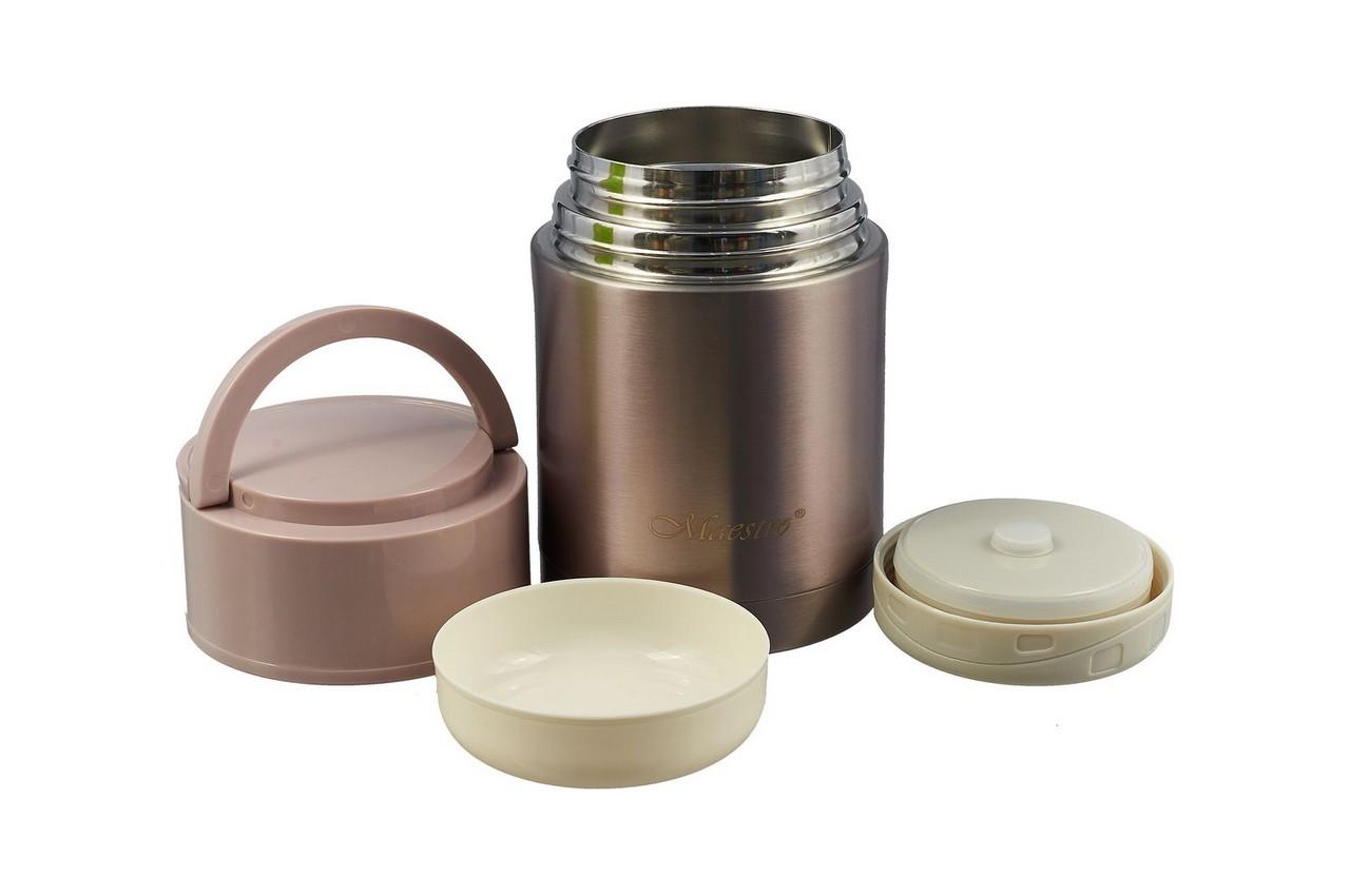 Термос для їжі Maestro MR 1636-60 об’ємом 600 мл випускається в нержавіючому корпусі. Піала і кришка, що відкручується, можуть бути використані в якості тарілок. Зручні ручки, які за необхідності загинаються і стають частиною кришки